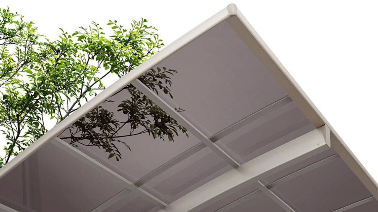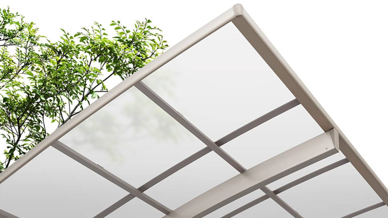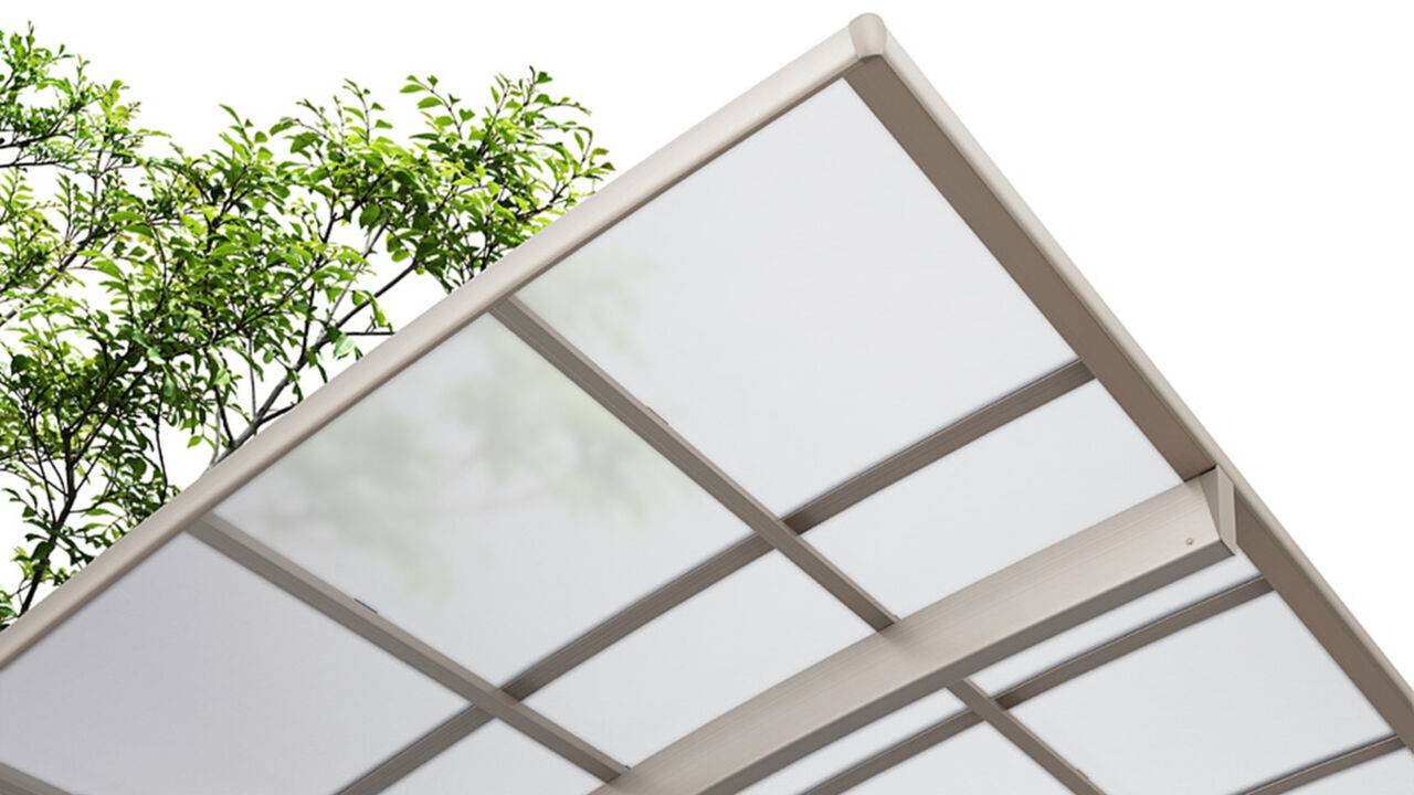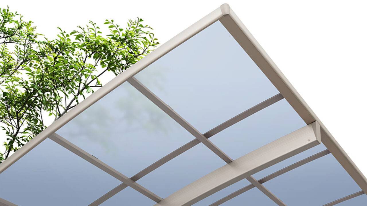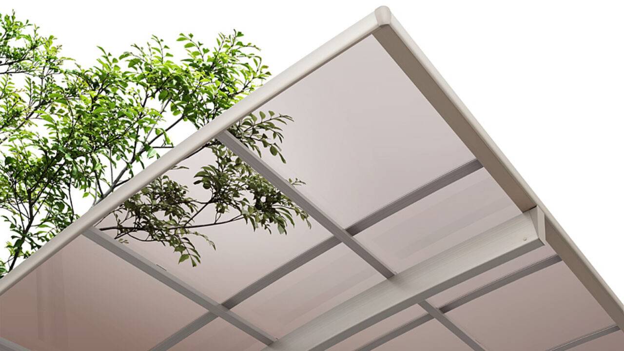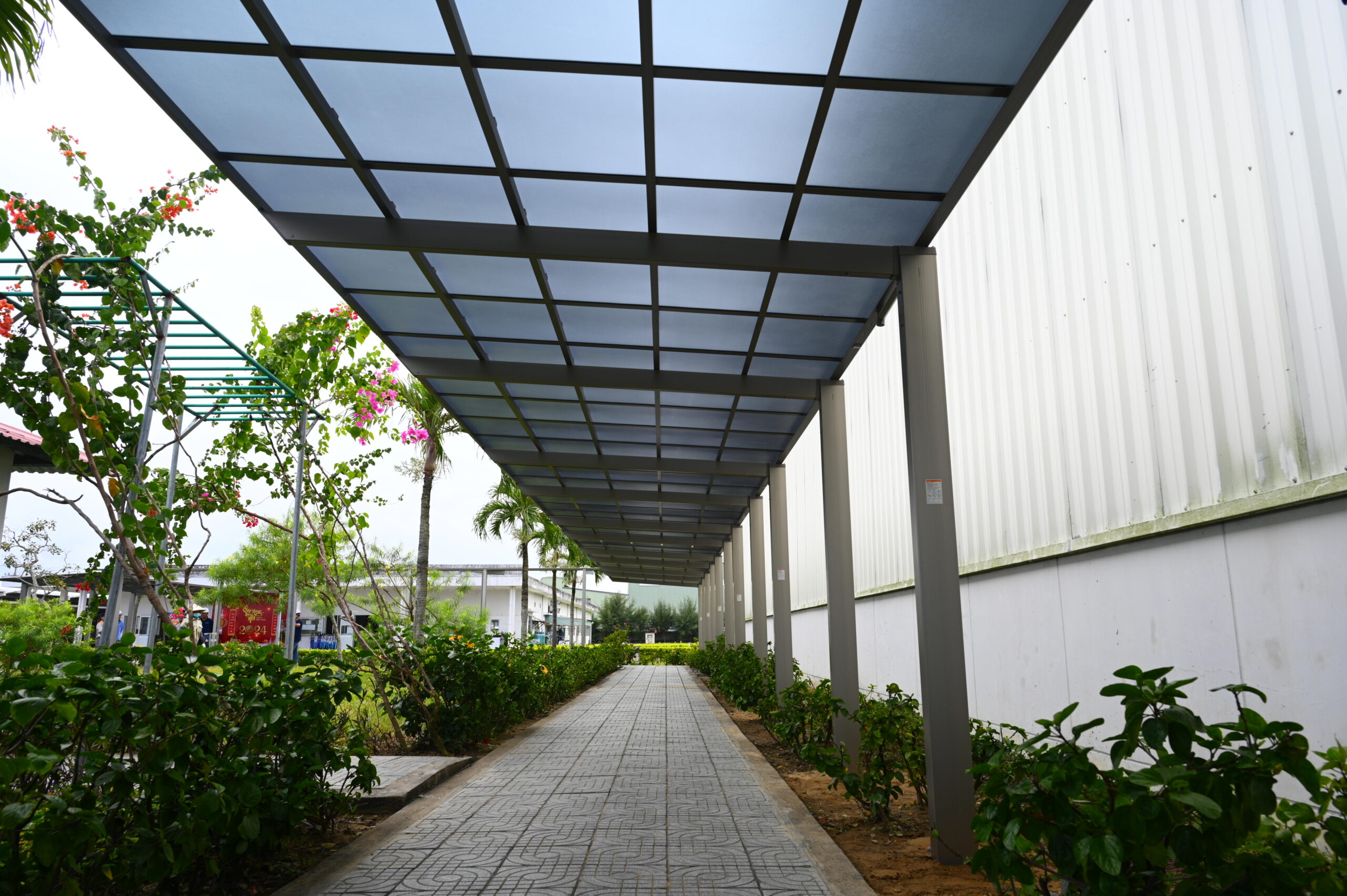 - Tấm mái chất liệu polycarbonate có độ cứng gấp 200 lần kính, cắt tia UV 100%, hấp thụ nhiệt tối ưu.